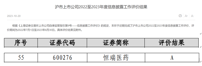 近日,上海交易所公布了沪市上市公司2022-2023年度信息披露工作评价结果,凭借在信息披露、规范运作以及投资者关系管理等方面的优秀表现,一飞冲天300倍游戏医药获评A级。本次共有2160家沪市上市公司参评(包括499家科创板上市公司),评价等级从高到低依次为A、B、C、D四类,获得A类评价的上市公司占比约18.5%。